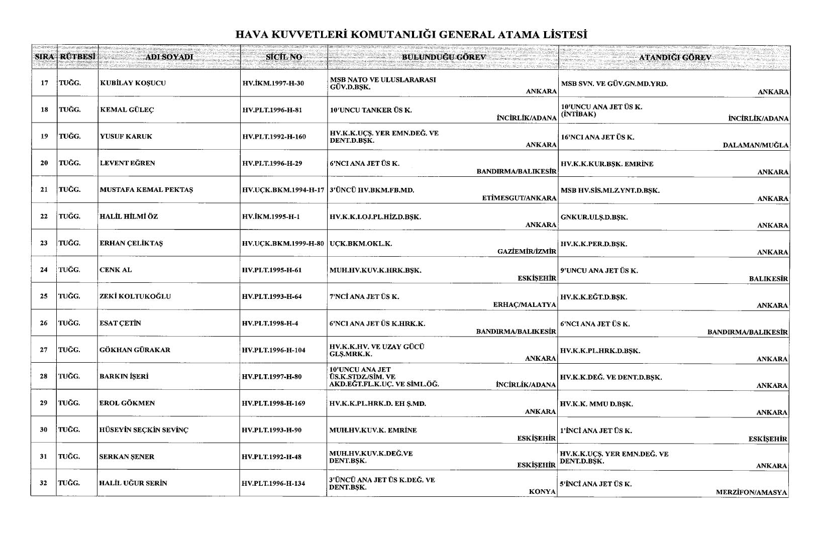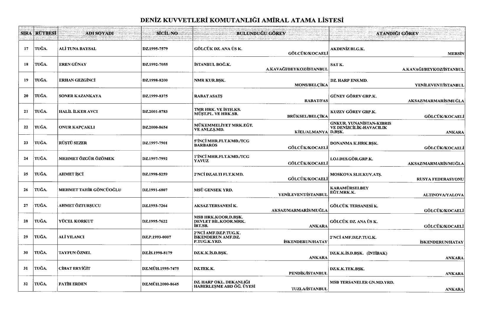 Deniz Kuvvetleri Komutanlığı'nda 32 amiral, Hava Kuvvetleri Komutanlığı'nda ise 38 generalin görev yerleri ve pozisyonları değişti.