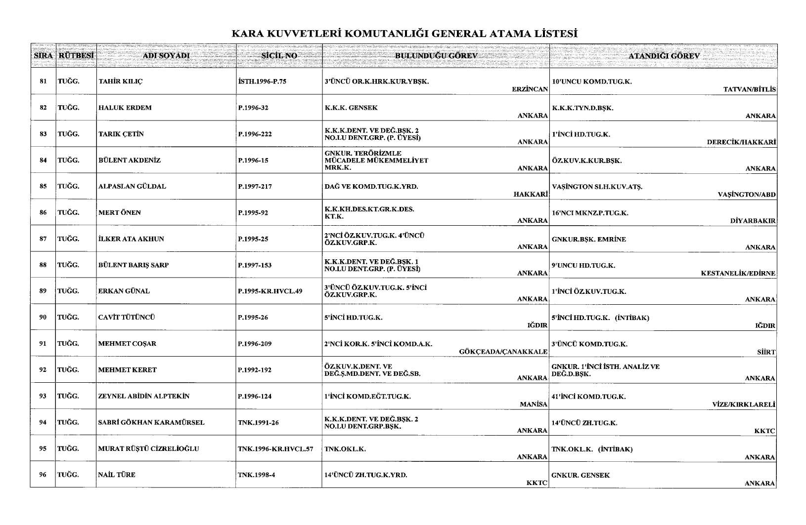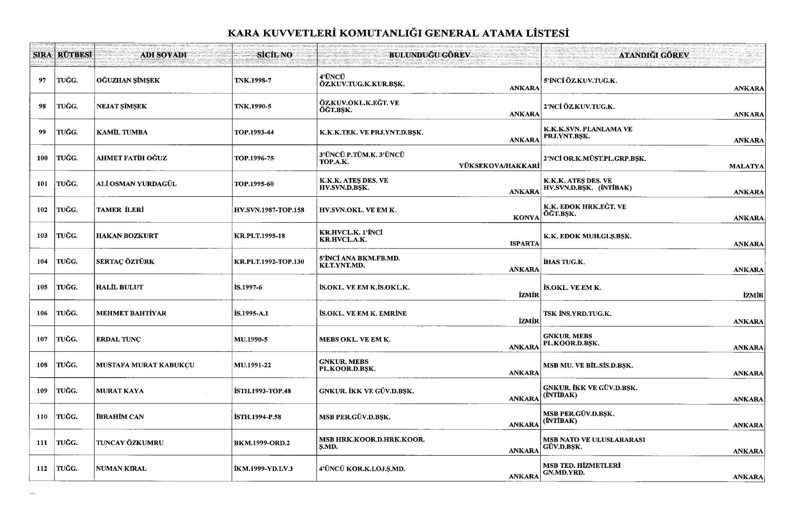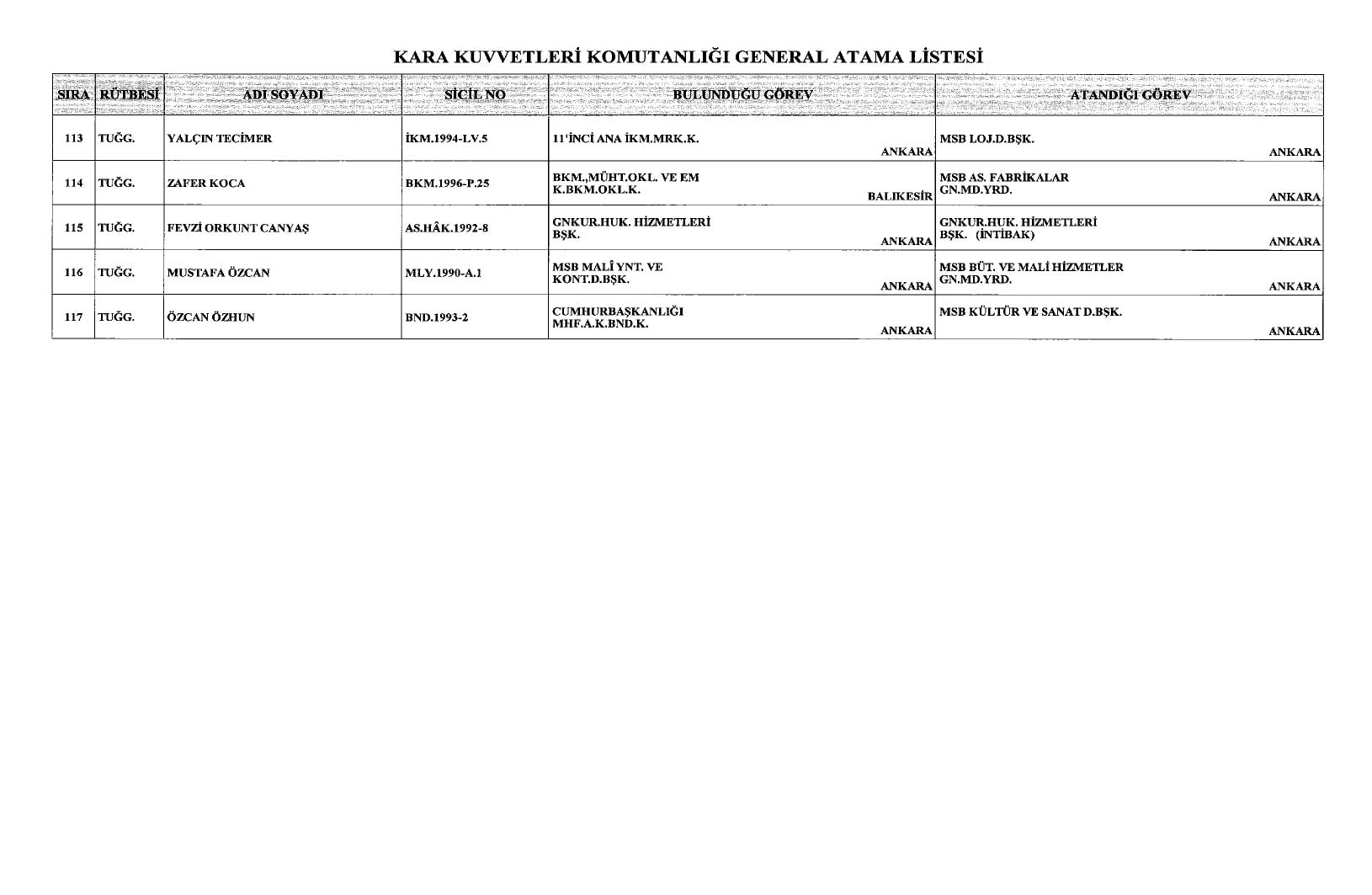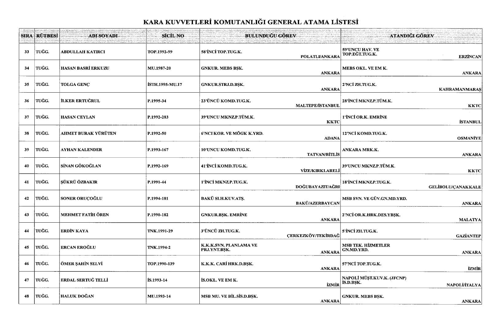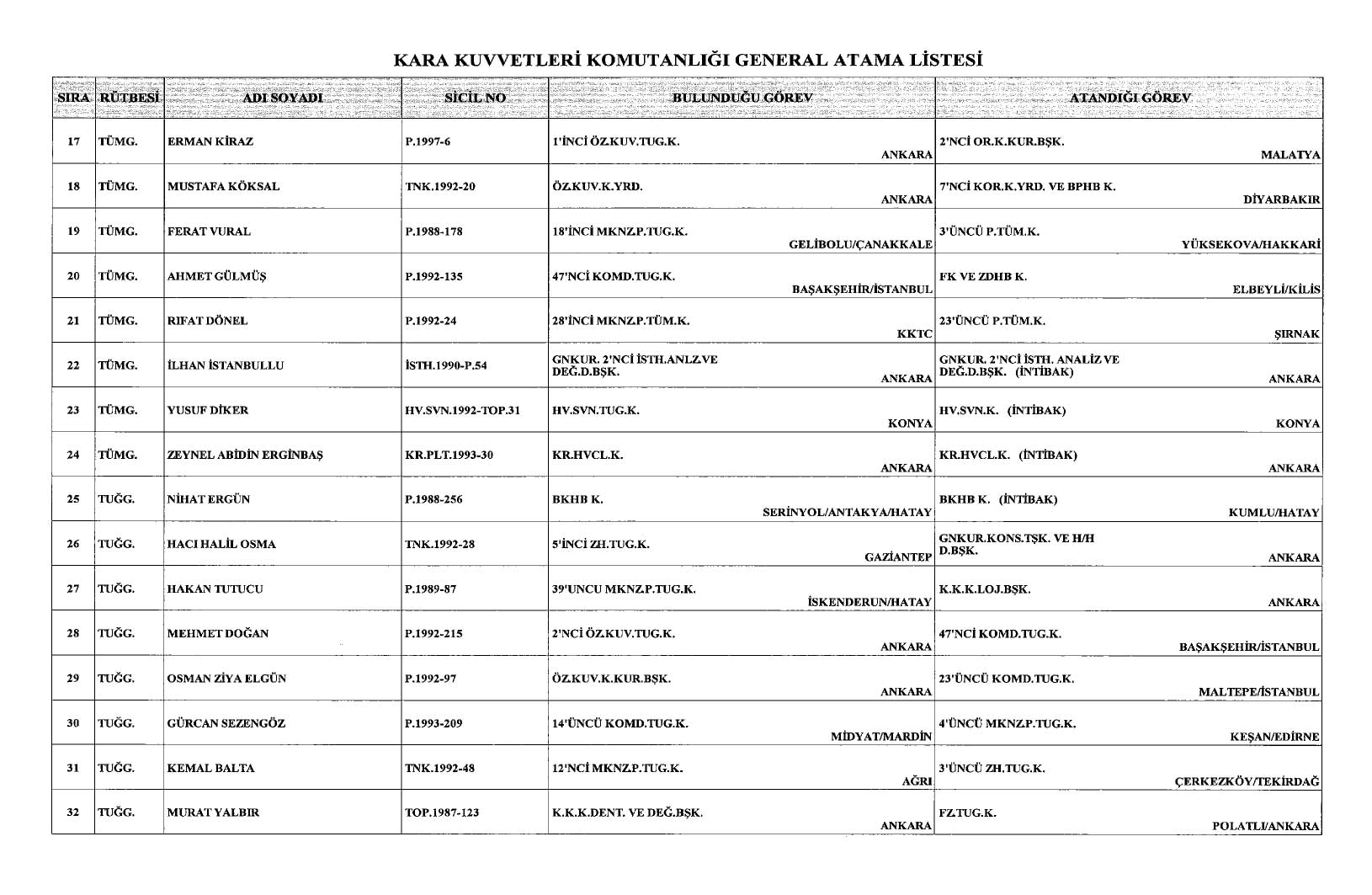 Cumhurbaşkanı Recep Tayyip Erdoğan imzasıyla yayımlanan kararlara göre, Kara Kuvvetleri Komutanlığı bünyesinde görev yapan 117 generalin ataması yapıldı.