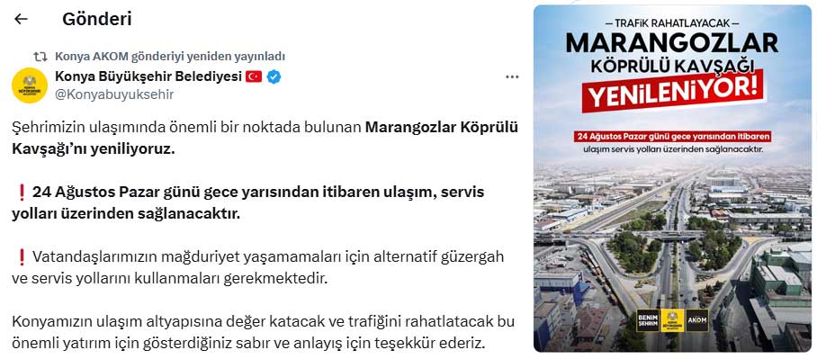 Konya Büyükşehir Belediyesi, AKOM ve Başkan Altay'ın sosyal medya hesapları bölgede yapılacak çalışmayı en az 10 gün önceden duyurdu. Hazırlığını yapan sürücüler söz konusu bölgede herhangi bir sorun yaşamadı. Durumdan habersiz vatandaşlar ise şehirde daha önce yapılan kritik çalışmalar esnasında gösterdiği sağduyuyu burada da ortaya çıkardı. Bu durum ise şehir insanının uyumunu bir kez daha ortaya koydu.