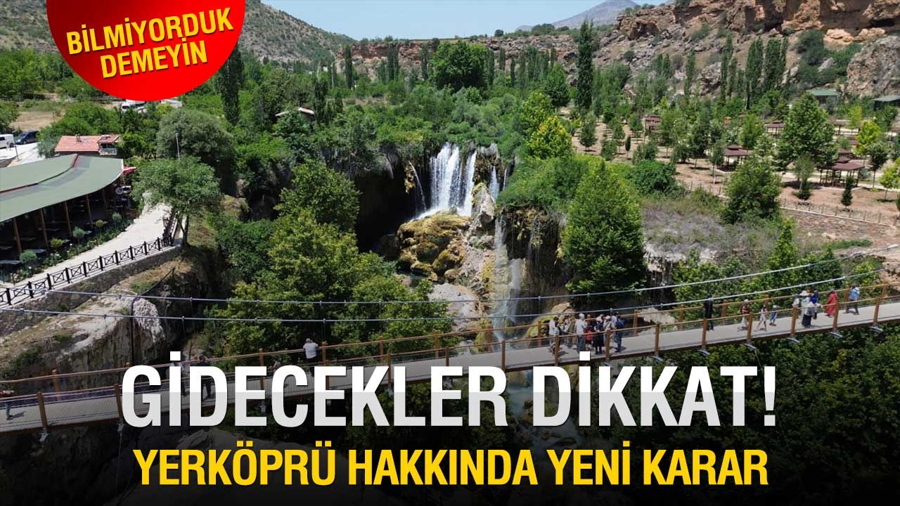 Adını, alüvyon tabakası üzerine çöken travertenin oluşturduğu doğal köprü şeklinden alan Yerköprü Şelalesi, 25 metre yükseklikten dökülen sularıyla yılın her döneminde büyüleyici bir manzara sunuyor. Haziran ayında açan zakkumlar ve renkli çiçekler, şelaleye ayrı bir güzellik katıyor.